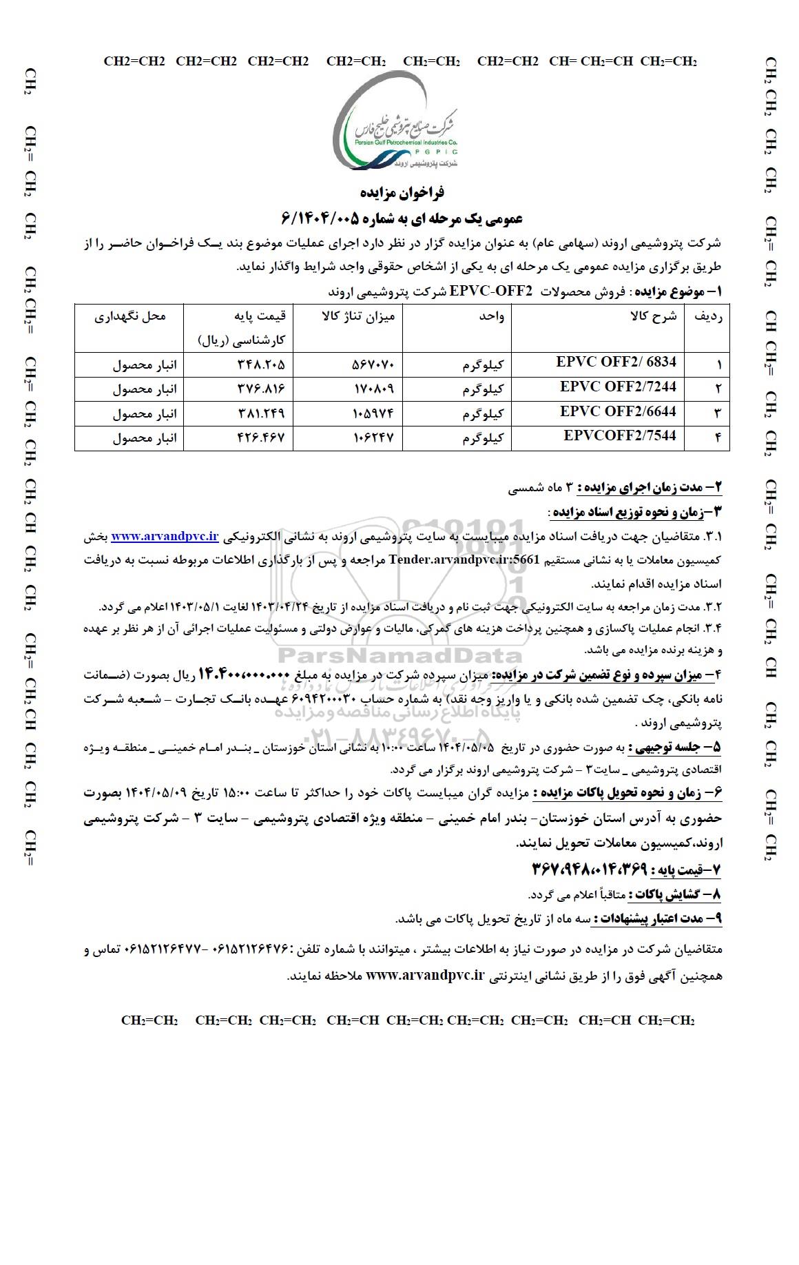 مزایده عمومی فروش محصولات EPVC- OFF2, مزایده عمومی فروش محصولات EPVC- OFF2