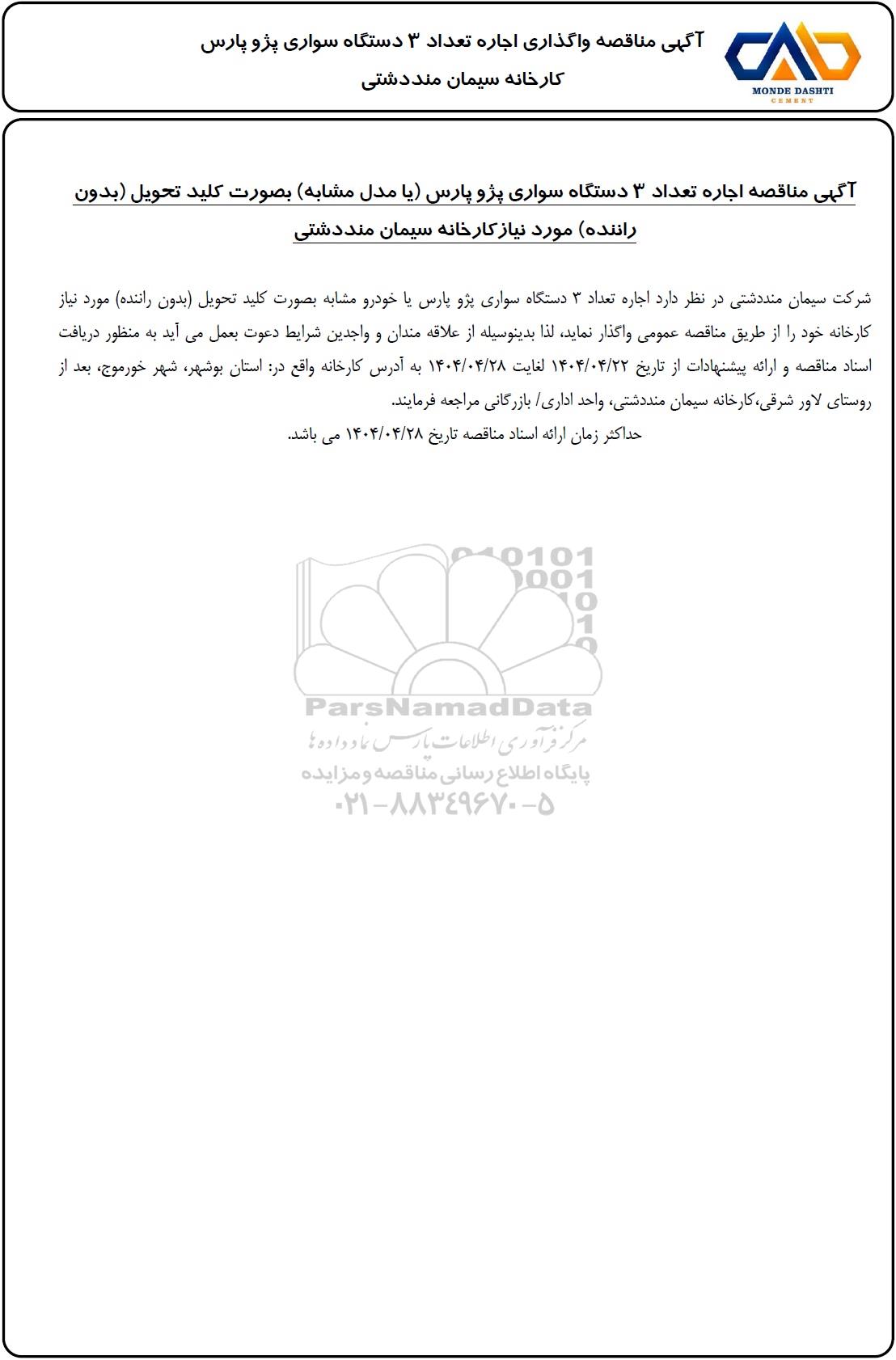 شرکت سیمان منددشتی در نظر دارد اجاره تعداد 3 دستگاه سواری پژو پارس یا خودرو مشابه بصورت کلید تحویل (بدون راننده) مورد نیاز کارخانه خود را از طریق مناقصه عمومی واگذار نماید، لذا بدینوسیله از علاقه مندان و واجدین شرایط دعوت بعمل می آید به منظور دریافت اسناد مناقصه و ارائه پیشنهادات از تاریخ 1404.04.22 لغایت 1404.04.28 به آدرس کارخانه واقع در: استان بوشهر، شهر خورموج، بعد از روستای لاور شرقی، کارخانه سیمان منددشتی، واحد اداری / بازرگانی مراجعه فرمایند.