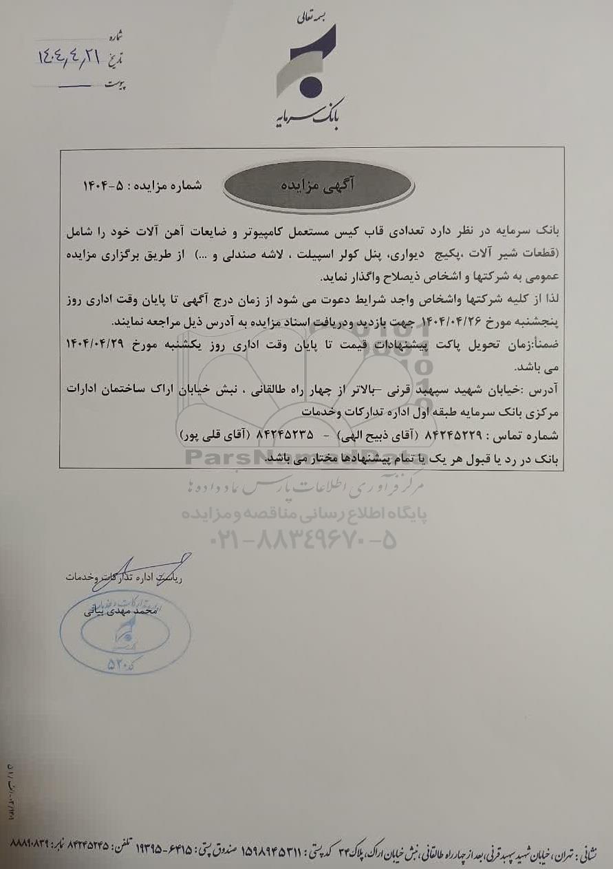 بانک سرمایه در نظر دارد تعدادی قاب کیس مستعمل کامپیوتر و ضایعات آهن آلات خود را شامل (قطعات شیر آلات، پکیچ دیواری، پنل کولر اسپیلت، لاشه صندلی و...) از طریق مزایده عمومی به شرکتها و اشخاص ذیصلاح واگذار نماید.