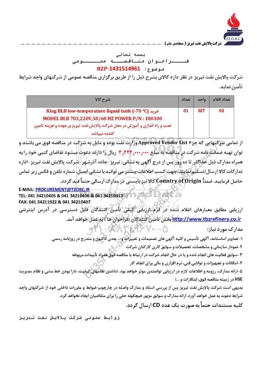 شرکت پالایش نفت تبریز در نظر دارد کالای بشرح ذیل را از طریق برگزاری مناقصه عمومی از شرکتهای واجد شرایط تامین نماید.