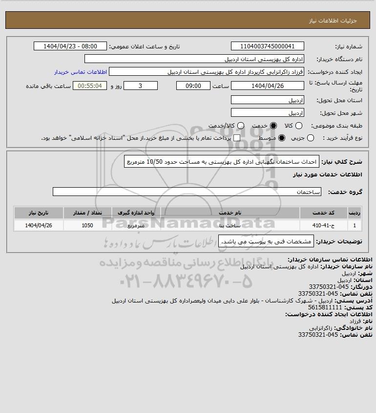 شرح کلی نیاز: احداث ساختمان نگهبانی اداره کل بهزیستی به مساحت حدود 10/50 مترمربع