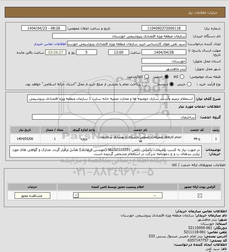 شرح کلی نیاز: استعلام ترمیم وآب بند سازی حوضچه ها و مخازن تصفیه خانه سایت 1 سازمان منطقه ویژه اقتصادی پتروشیمی