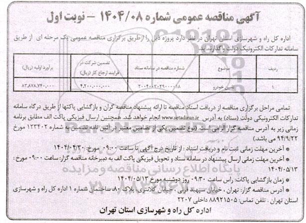 اداره کل راه و شهرسازی استان تهران در نظر دارد پروژه ذیل را از طریق برگزاری مناقصه عمومی یک مرحله ای با ارزیابی کیفی از طریق سامانه تدارکات الکترونیک دولت واگذار نماید.