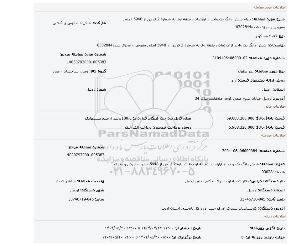 مزایده عمومی مزایده شش دانگ یک واحد از آپارتمان طبقه اول به شماره 2 فرعی از 5948 اصلی مفروض و مجزی شده0302844 برگزار میگردد. از کلیه افراد متخصص و شرکت‌های واجد شرایط دعوت به عمل می‌آید تا در این مزایده با کد خبرگزاری پارس نماد : 9266443 شرکت نمایند تاریخ شروع مزایده : 1404/04/22 مهلت شرکت در مزایده: تا پایان روز 1404/05/20 مکان برگزاری اموال واگذاری استان‌های اردبیل و دسته‌بندی‌های مربوط به این حراجی املاک و زمین میباشد. اطلاعات دقیق‌تر درباره شرایط شرکت در مزایده آنلاین و نحوه ارسال مدارک، الزامات پروژه و دریافت اسناد مزایده و تاریخ بازگشایی پاکت‌ها، در بخش اطلاعات تکمیلی این آگهی درج شده است.