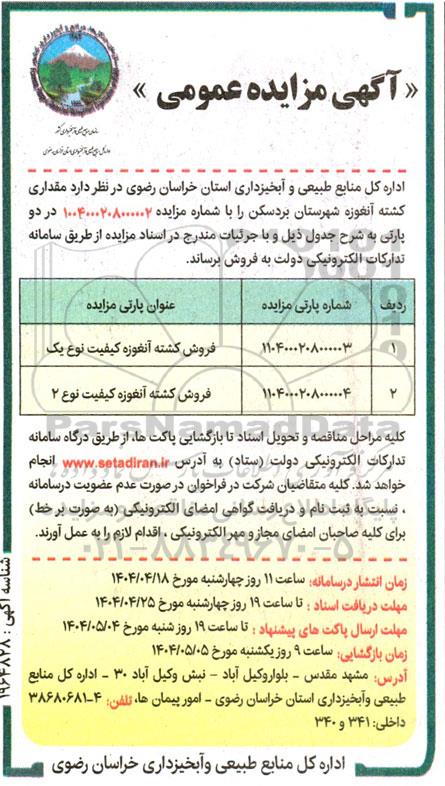 اداره کل منابع طبیعی و آبخیزداری استان خراسان رضوی در نظر دارد مقداری کشته آنغوره شهرستان بردسکن را به شماره مزایده 1004000208000002 در دو پارتی به شرح جدول ذیل را با جزئیات مندرج در اسناد مزایده از طریق سامانه تدارکات الکترونیکی دولت برگزار نماید