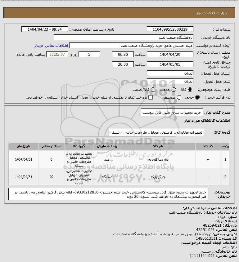 شرح کلی نیاز: خرید تجهیزات سرور طبق فایل پیوست