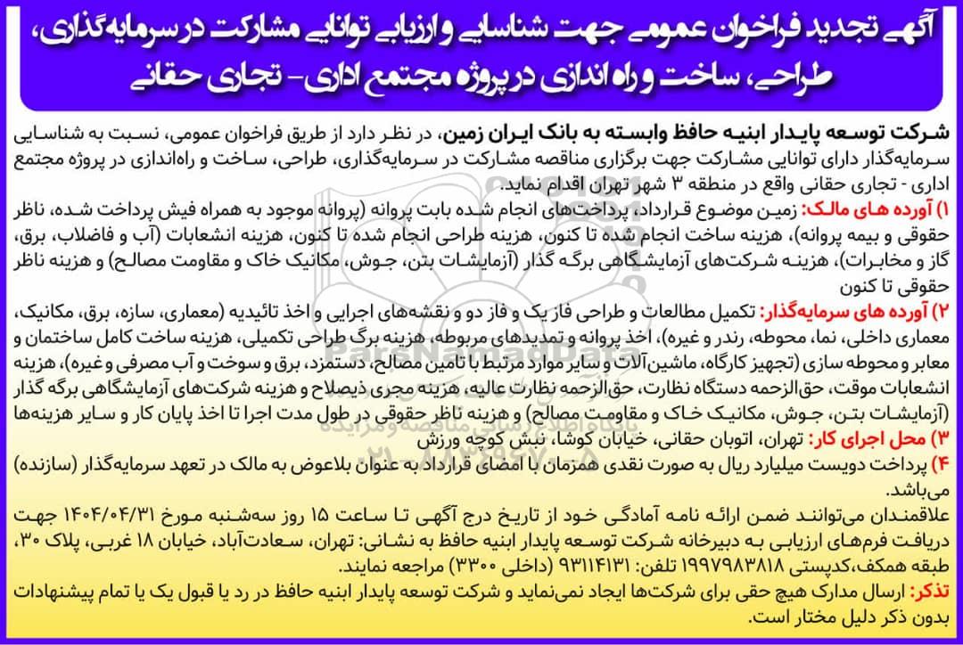 شرکت توسعه پایدار ابنیه حافظ وابسته به بانک ایران زمین، در نظر دارد از طریق فراخوان عمومی، نسبت به شناسایی سرمایه گذار دارای توانایی مشارکت جهت برگزاری مناقصه شرکت در سرمایه گذاری، طراحی، ساخت و راه اندازی در پروژه مجتمع اداری - تجاری حقانی واقع در منطقه 3 شهر تهران اقدام نماید.