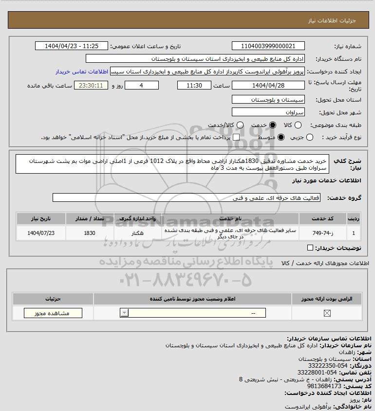 شرح کلی نیاز: خرید خدمت مشاوره تدقیق 1830هکتاراز اراضی محاط واقع در پلاک 1012 فرعی از 1اصلی اراضی موات بم پشت شهرستان سراوان طبق دستورالعمل پیوست به مدت 3 ماه