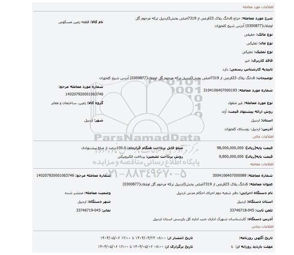 شرح مورد معامله: حراج 6دانگ پلاک 23فرعی از 7319اصلی بخش3اردبیل ترکه مرحوم گل اوغلان(0300877) آدرس شیخ کلخوران نام کالا: قطعه زمین مسکونی