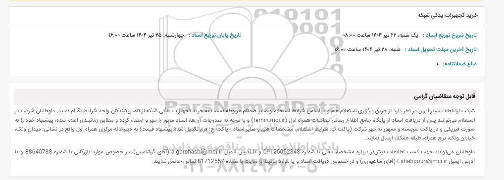 داوطلبان میتوانند جهت کسب اطلاعات بیشتر درباره مشخصات فنی با شماره 09125052348 و یا آدرس ایمیل a.garshasbi@mci.ir (آقای گرشاسبی)، در خصوص موارد بازرگانی با شماره 88640788 و یا آدرس ایمیل t.shahpouri@mci.ir (آقای شاهپوری) و در خصوص دریافت اسناد و یا موارد مرتبط با سایت با شماره 81712557 تماس حاصل نمایند.