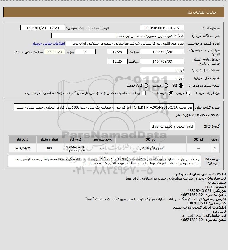 شرح کلی نیاز: تونر پرینتر TONER HP –2014-2015(53A) با گارانتی و ضمانت یک ساله،تعداد100عدد،کالای انتخابی جهت تشابه است.