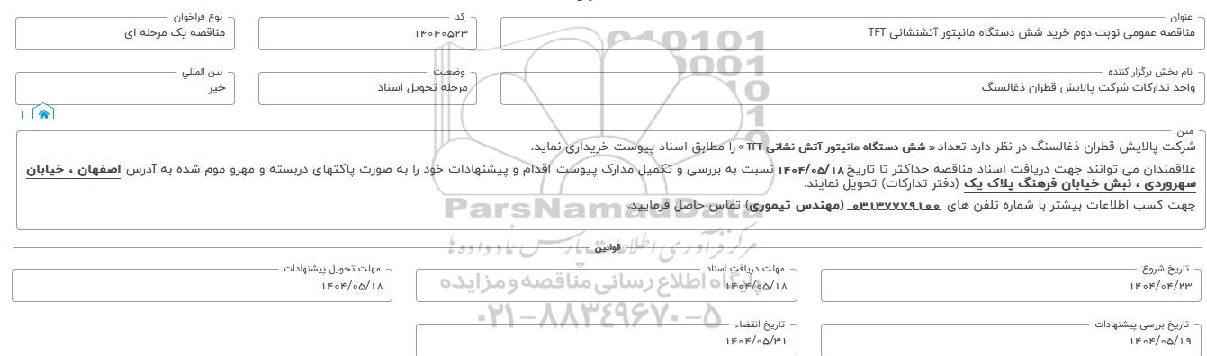 مناقصه عمومی خرید شش دستگاه مانیتور آتشنشانی TFT - نوبت دوم از کلیه افراد متخصص و شرکتها واجد شرایط دعوت به عمل میآید در مناقصه با کد خبرگزاری پارس نماد: 9269490 شرکت نمایند.