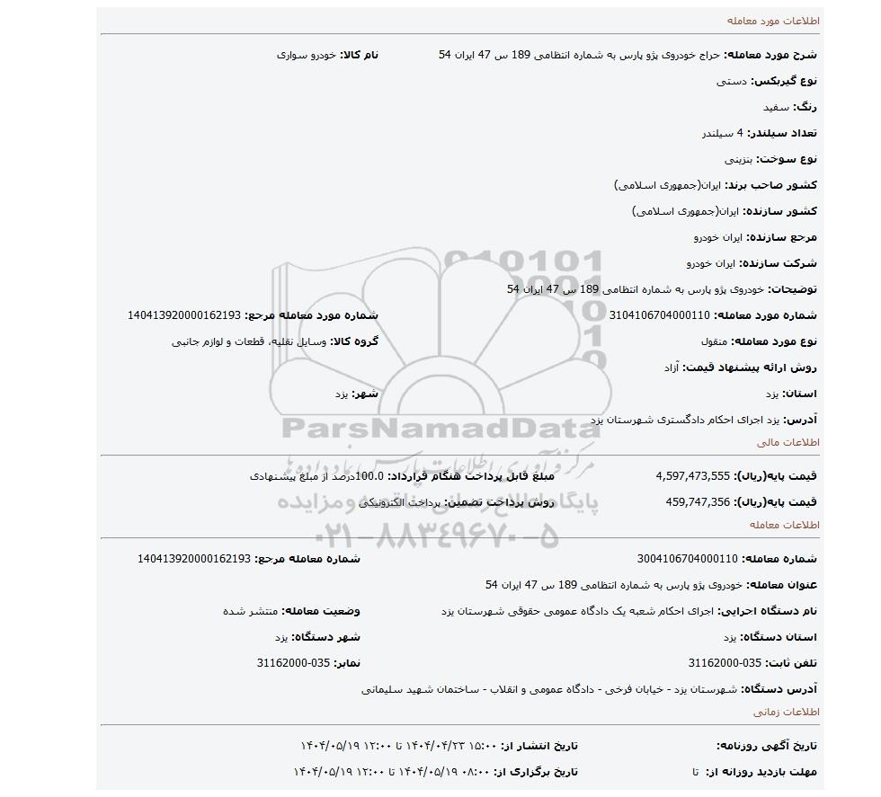 | شرح مورد معامله: حراج خودروی پژو پارس به شماره انتظامی 189 س 47 ایران 54 | نام کالا: خودرو سواری | |