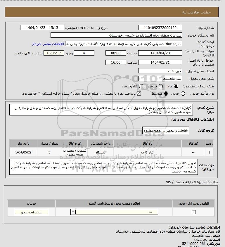 شرح کلی نیاز: کولر(تعداد،مشخصات،برندو شرایط تحویل کالا بر اساس استعلام و شرایط شرکت در استعلام پیوست.حمل و نقل و تخلیه بر عهده تامین کننده می باشد)