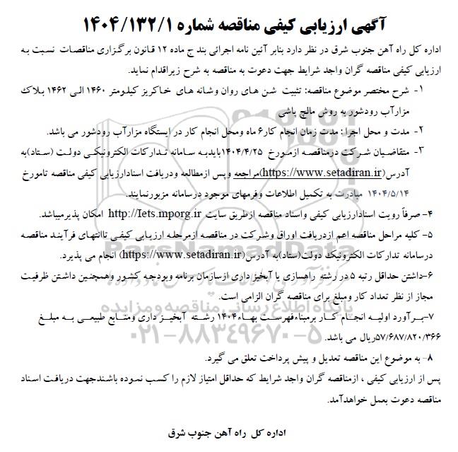 اداره کل راه آهن جنوب شرق در نظر دارد بنابر آئین نامه اجرائی بند ج ماده 12 قانون برگزاری مناقصات نسبت به ارزیابی کیفی مناقصه گران واجد شرایط جهت دعوت به مناقصه به شرح زیر اقدام نماید.