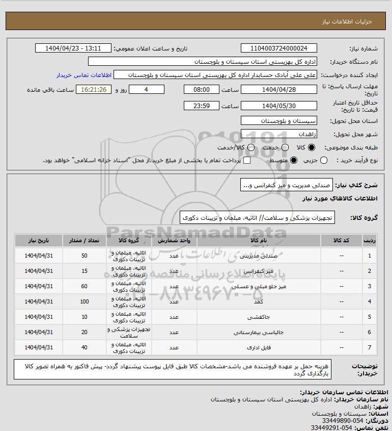 | 1 | -- | صندلی مدیریتی | عدد | اثاثیه، مبلمان و تزیینات دکوری | 50 | 1404/04/31 |