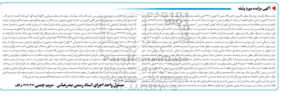 مزایده یک دستگاه آپارتمان پلاک ثبتی 115 فرعی از 263 اصلی