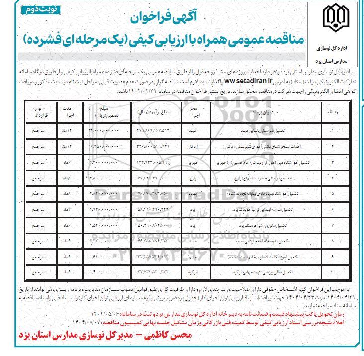 اداره کل نوسازی مدارس استان یزد در نظر دارد احداث پروژه های مشروحه ذیل را از طریق مناقصه عمومی یک مرحله ای فشرده همراه با ارزیابی کیفی و از طریق درگاه سامانه تدارکات الکترونیکی دولت (ستاد) به آدرس سایت ستاد ایران واگذار نماید. لازم است مناقصه گران در صورت عدم عضویت قبلی مراحل ثبت نام در سایت مذکور و دریافت گواهی امضای الکترونیکی را جهت شرکت در مناقصه محقق سازند. تاریخ انتشار فراخوان مناقصه در سامانه 1404.04.21 باشد.