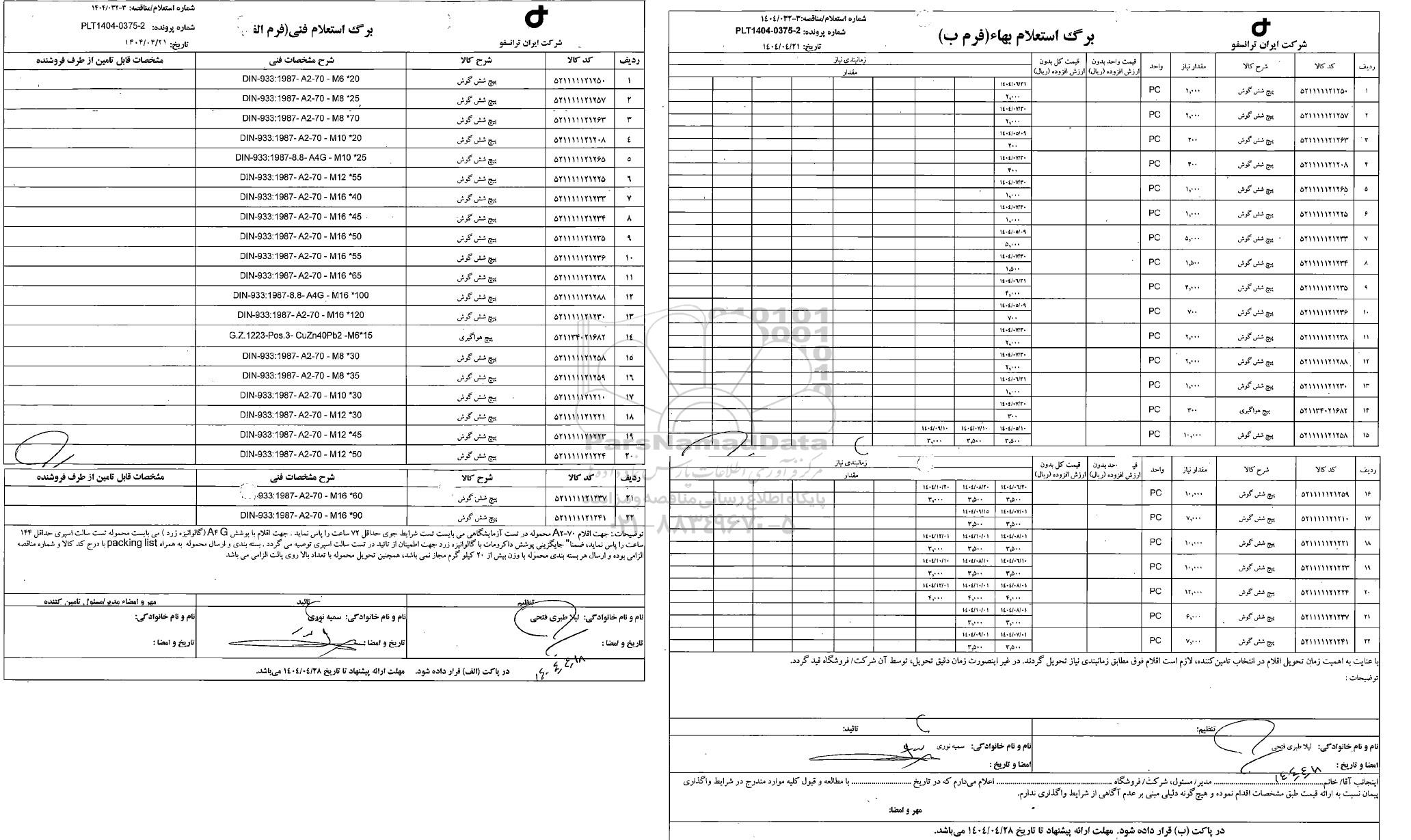 | 20 | 521111121224 | پیچ شش گوش | 12.000 | PC | 1404.08.1 4000 |