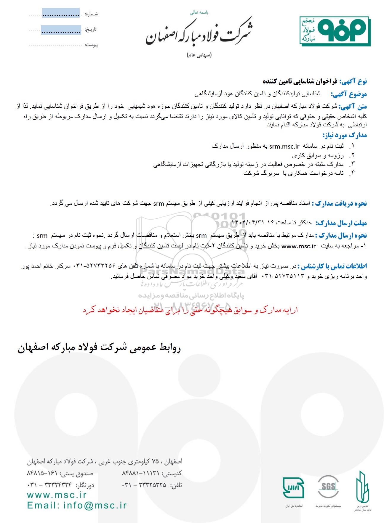 متن آگهی: شرکت فولاد مبارکه اصفهان در نظر دارد تولید کنندگان و تامین کنندگان حوزه هود شیمیایی خود را از طریق فراخوان شناسایی نماید. لذا از کلیه اشخاص حقیقی و حقوقی که توانایی تولید و تأمین کالای مورد نیاز را دارند تقاضا میگردد نسبت به تکمیل و ارسال مدارک مربوطه از طریق راه ارتباطی به شرکت فولاد مبارکه اقدام نمایند.