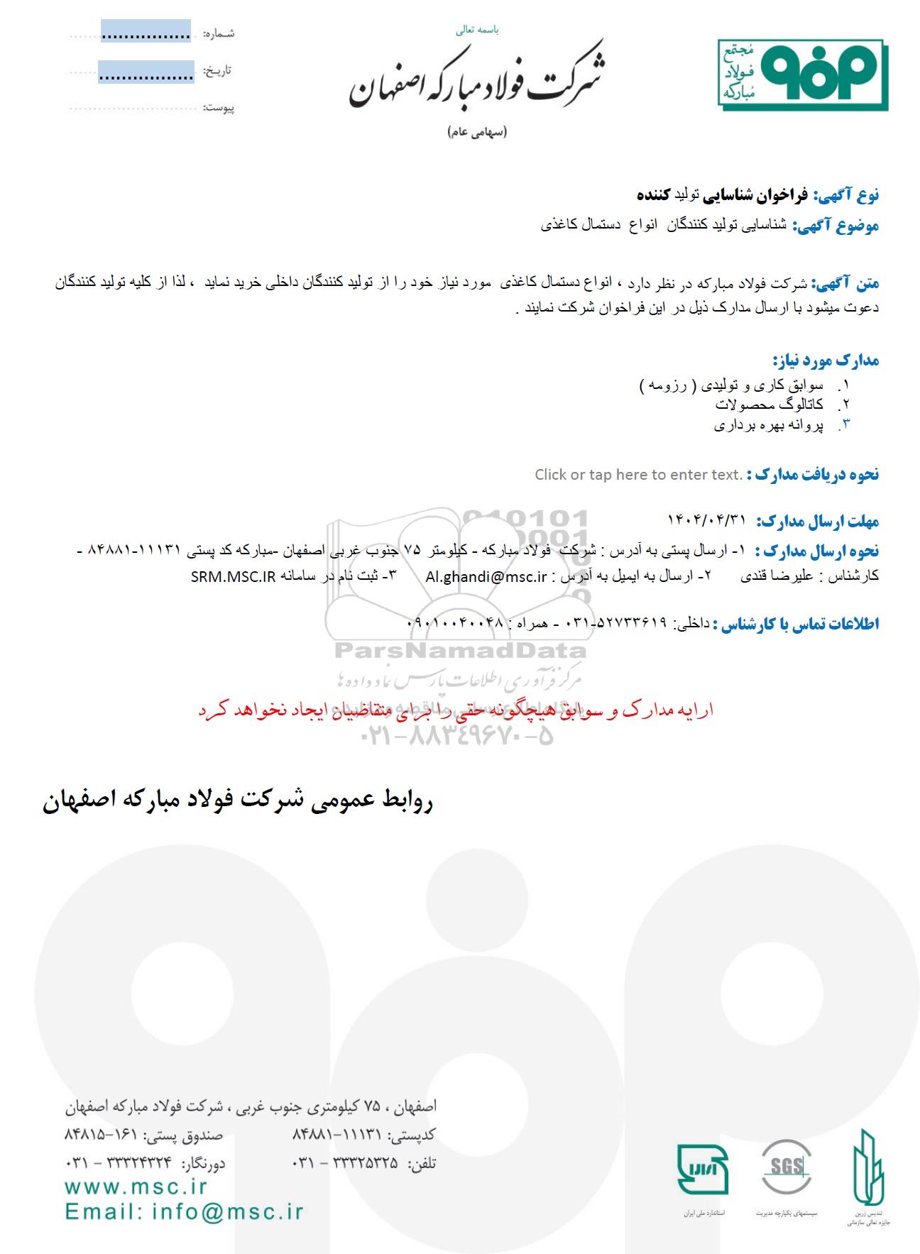 متن آگهی: شرکت فولاد مبارکه در نظر دارد، انواع دستمال کاغذی مورد نیاز خود را از تولید کنندگان داخلی خرید نماید، لذا از کلیه تولید کنندگان دعوت می شود با ارسال مدارک ذیل در این فراخوان شرکت نمایند .