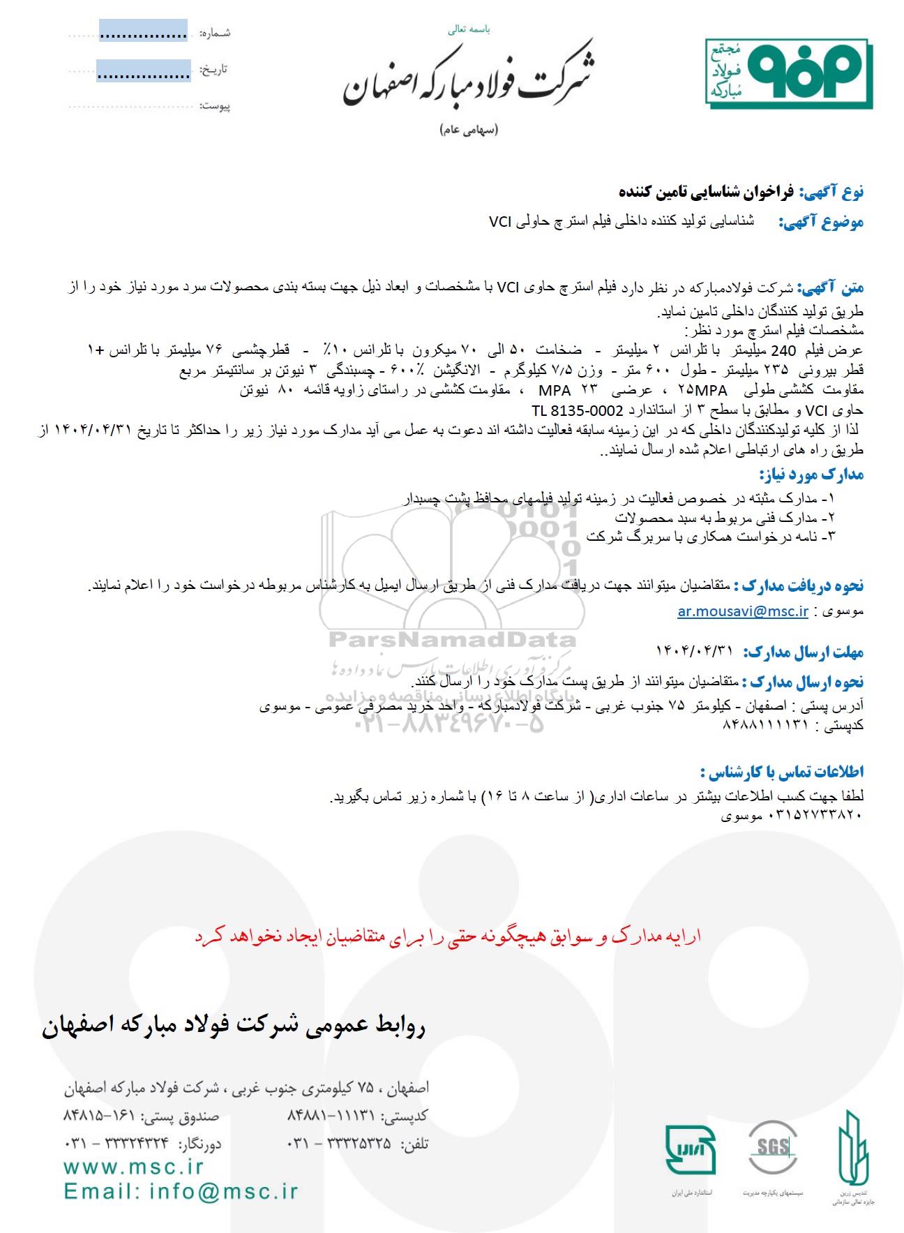 متن آگهی: شرکت فولاد مبارکه در نظر دارد فیلم استرچ حاوی VCI با مشخصات و ابعاد ذیل جهت بسته بندی محصولات سرد مورد نیاز خود را از طریق تولید کنندگان داخلی تامین نماید.