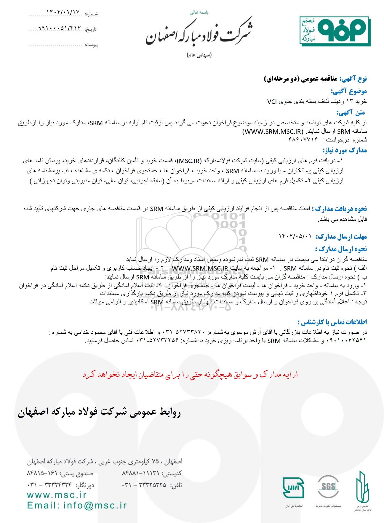 مناقصه عمومی خرید 13 ردیف لفاف بسته بندی حاوی VCI از کلیه افراد متخصص و شرکتها واجد شرایط دعوت به عمل میآید در مناقصه با کد خبرگزاری پارس نماد: 9271670 شرکت نمایند.