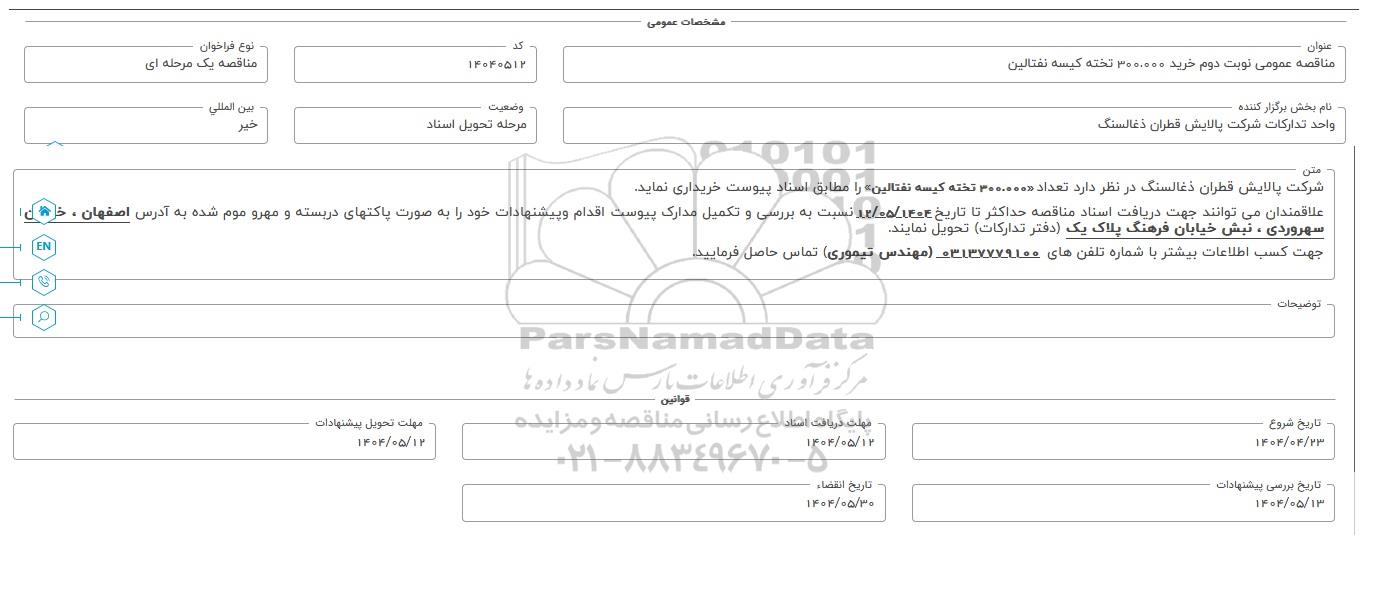 علاقمندان می توانند جهت دریافت اسناد مناقصه حداکثر تا تاریخ 1404.05.12 نسبت به بررسی و تکمیل مدارک پیوست اقدام و پیشنهادات خود را به صورت پاکتهای دربسته و مهر و موم شده به اصفهان، خیابان سهروردی، نبش خیابان فرهنگ پلاک یک (دفتر تدارکات) تحویل نمایند.