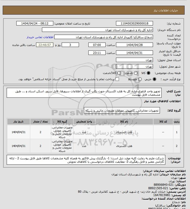 1 -- هارد اکسترنال عدد تجهیزات مخابراتی، کامپیوتر، موبایل، ملزومات جانبی و شبکه 2 1404/04/31
