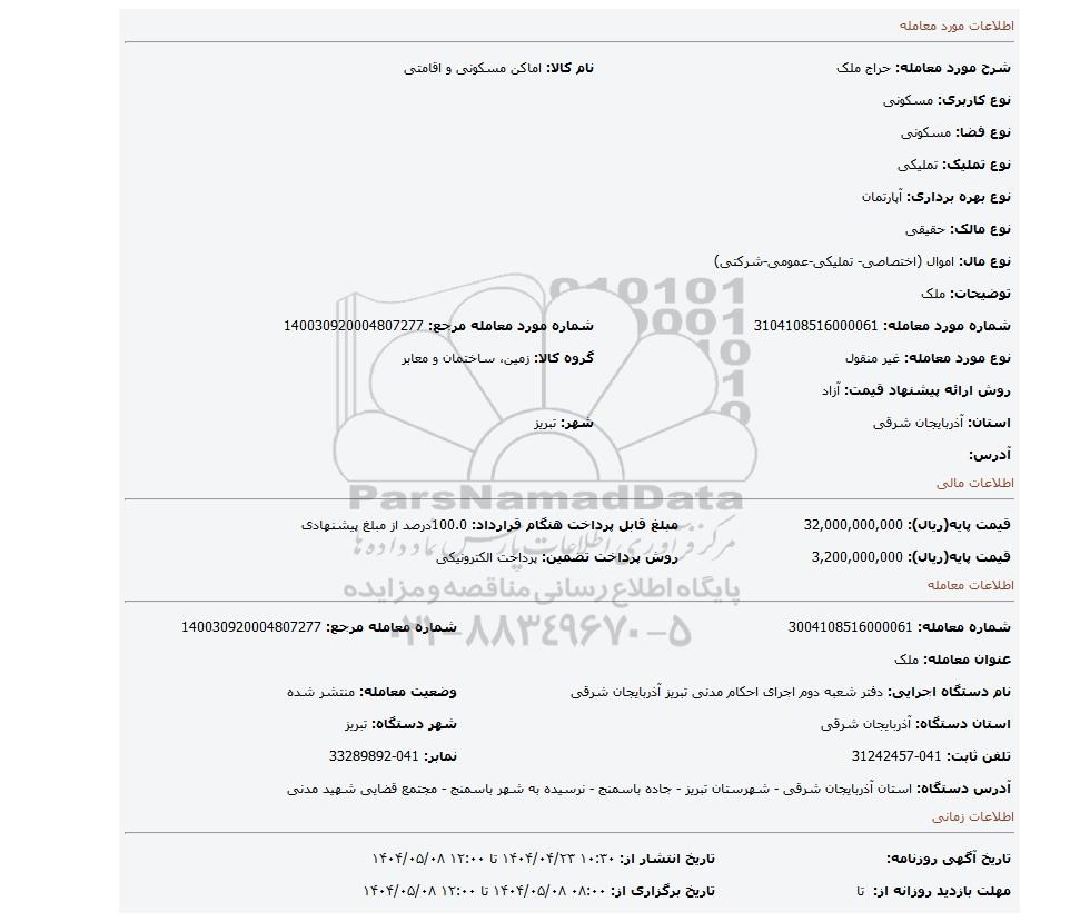 | شرح مورد معامله: حراج ملک | نام کالا: اماکن مسکونی و اقامتی | |