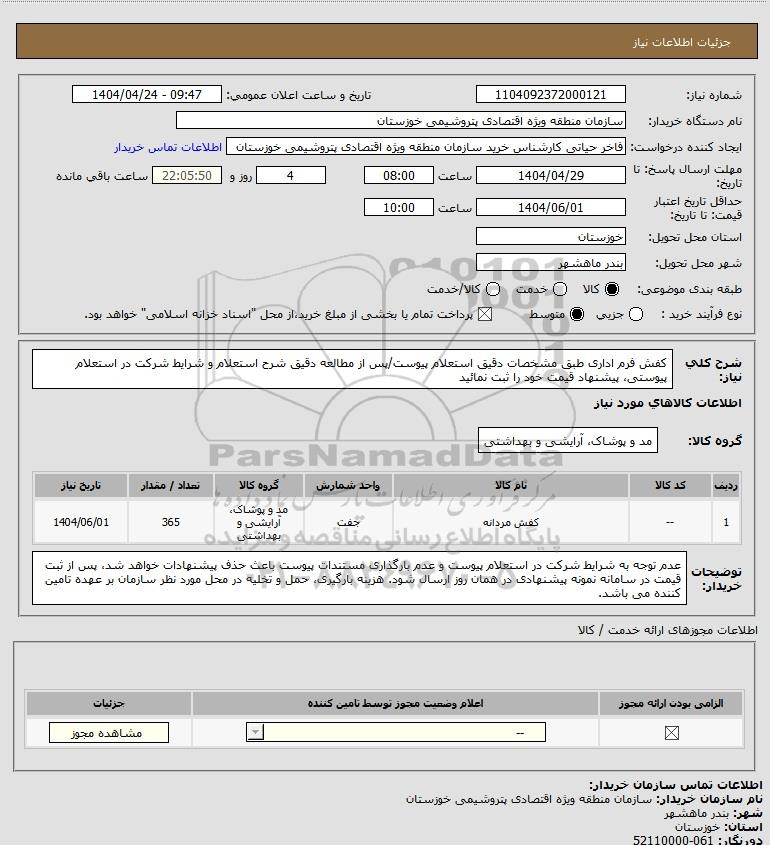 استعلام کفش فرم اداری طبق مشخصات دقیق استعلام پیوست/پس از مطالعه دقیق شرح استعلام و شرایط شرکت در استعلام پیوستی پیشنهاد قیمت خود را ثبت نمائید, استعلام کفش فرم اداری طبق مشخصات دقیق استعلام پیوست/پس از مطالعه دقیق شرح استعلام و شرایط شرکت در استعلام پیوستی، پیشنهاد قیمت خود را ثبت نمائید