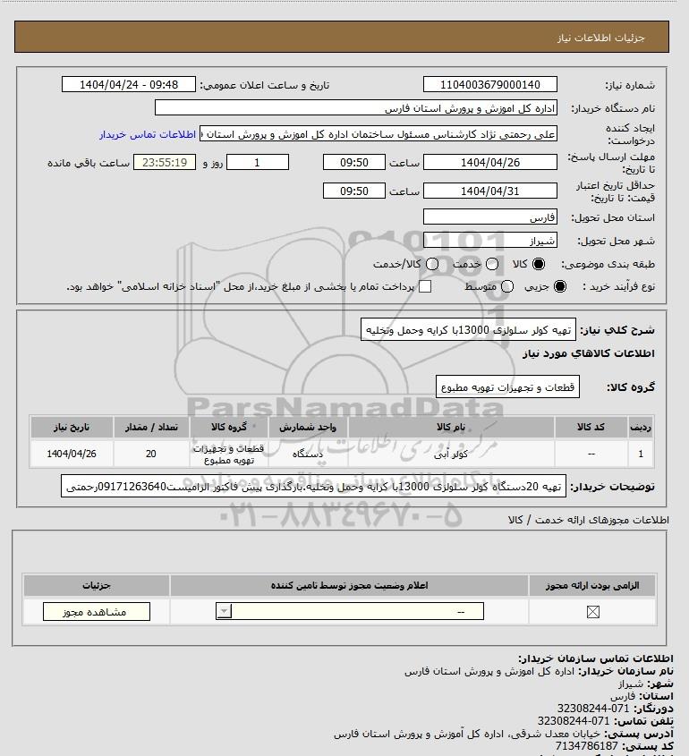 توضیحات خریدار:تهیه 20دستگاه کولر سلولزی 13000با کرایه وحمل وتخلیه.بارگذاری پیش فاکتور الزامیست09171263640رحمتی