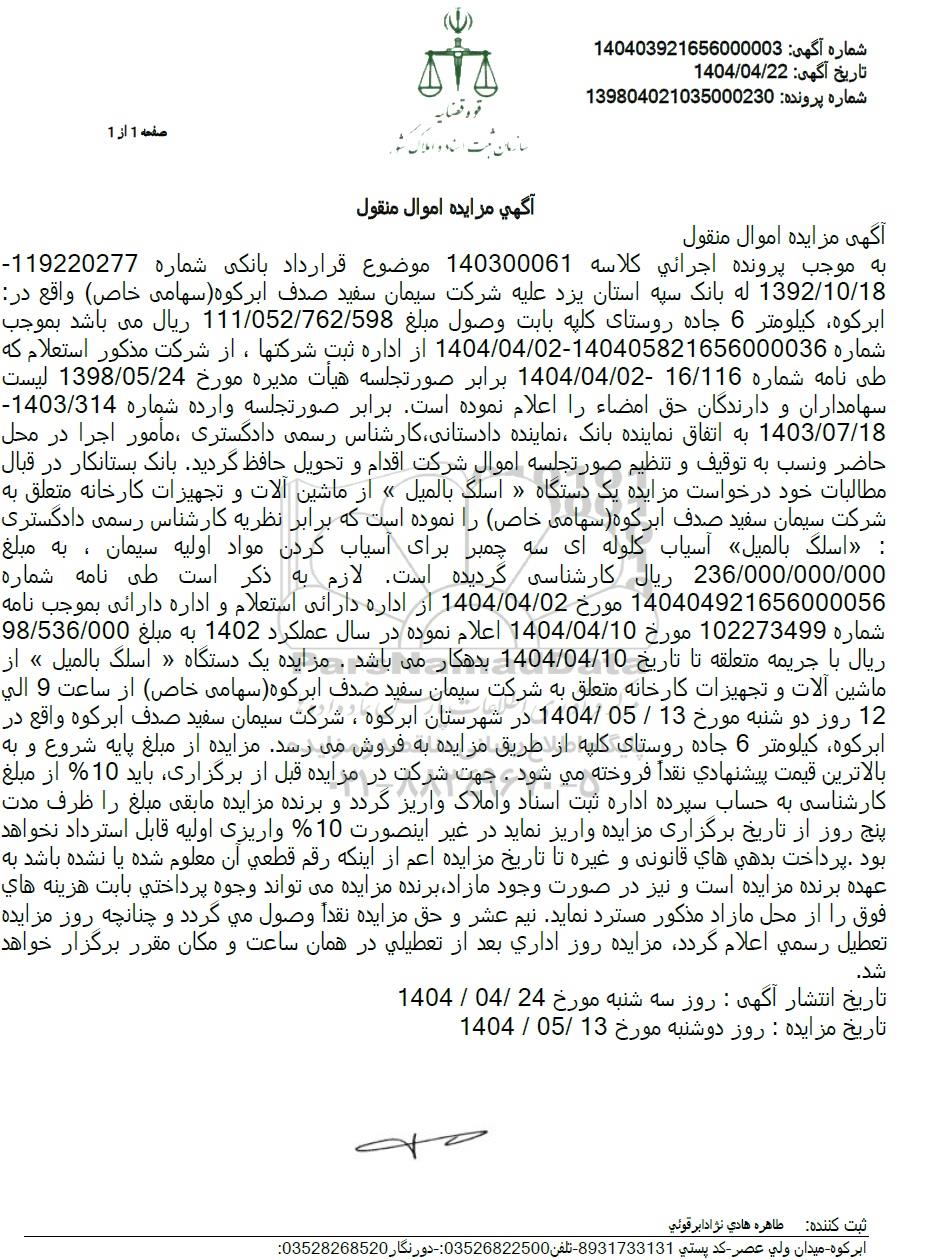 مزایده از ساعت 9 الی 12 روز دوشنبه مورخ 1404.5.13