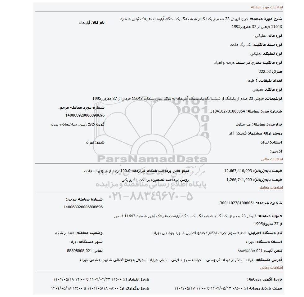 | شرح مورد معامله: حراج فروش 23 صدم از یکدانگ از ششدانگ یکدستگاه آپارتمان به پلاک ثبتی شماره 11643 فرعی از 37 مفروزاز1995 | نام کالا: آپارتمان | |
