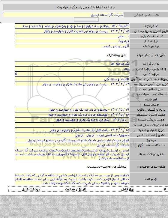مناقصه انجام خدمات نشت یابی شبکه ها و تاسیسات گازدار ذر سطح استان اردبیل از کلیه افراد متخصص و شرکتها واجد شرایط دعوت به عمل میآید در مناقصه با کد خبرگزاری پارس نماد: 9275638 شرکت نمایند.