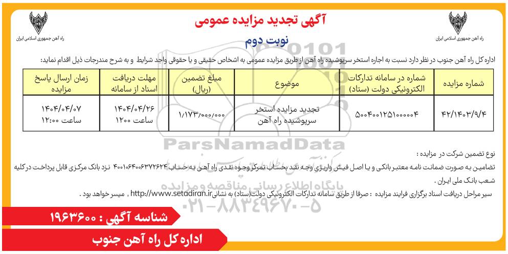 اداره کل راه آهن جنوب در نظر دارد نسبت به اجاره استخر سرپوشیده راه آهن از طریق مزایده عمومی به اشخاص حقیقی و یا حقوقی واجد شرایط و به شرح مندرجات ذیل اقدام نماید