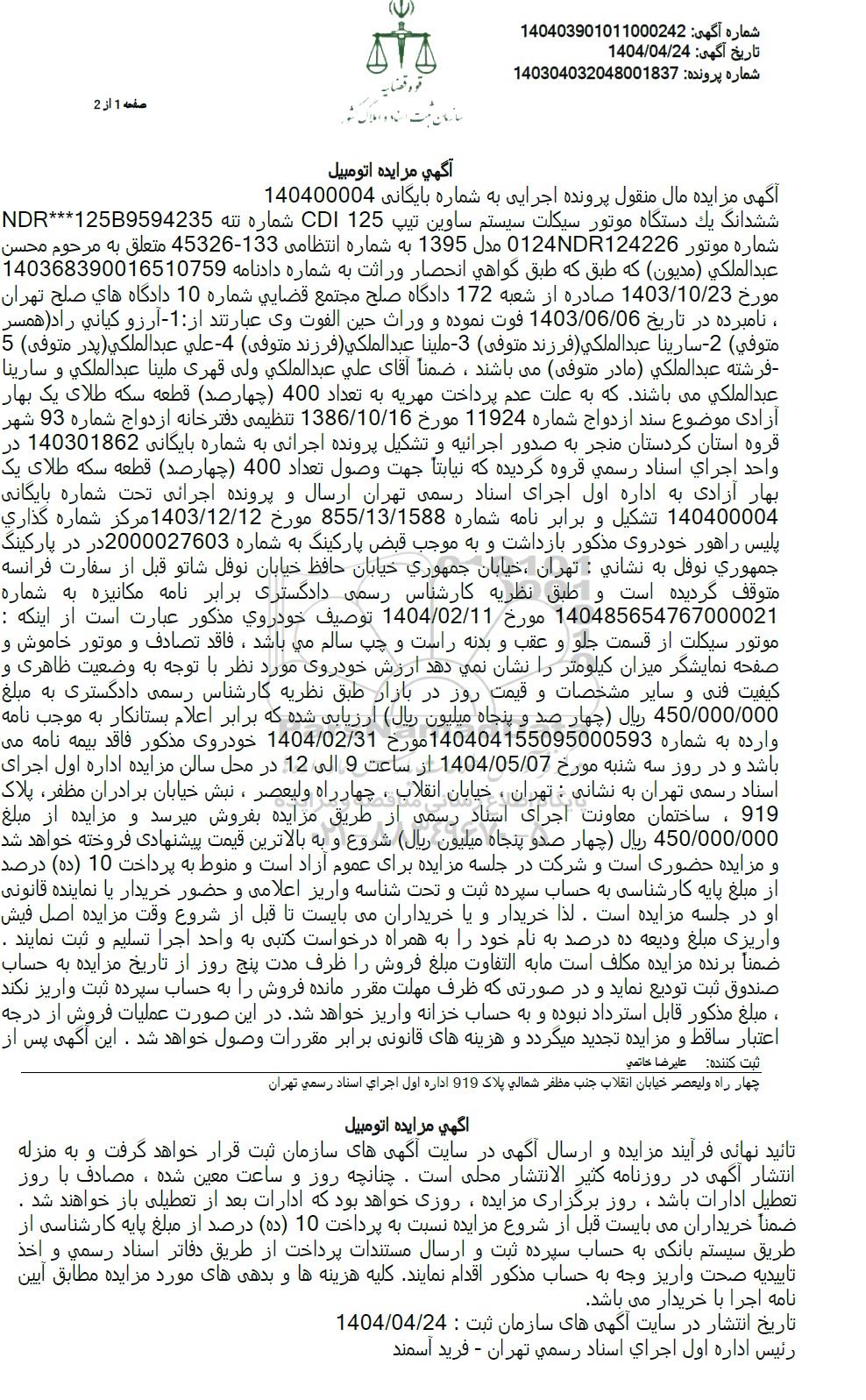 مزایده فروش یک دستگاه موتورسیکلت سیستم ساوین مدل 95