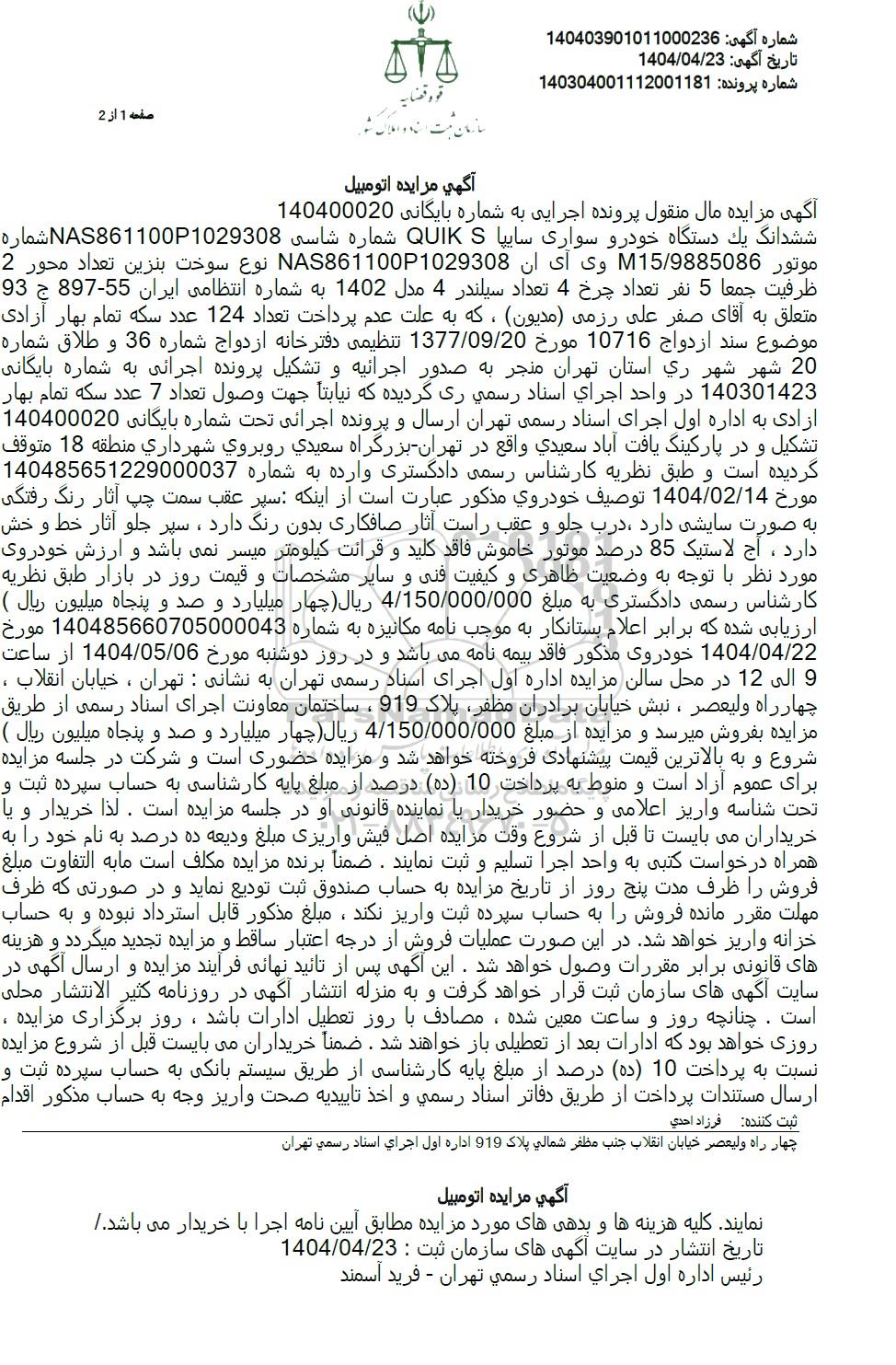 مزایده فروش ششدانگ یک دستگاه خودرو سواری سایپا مدل 1402