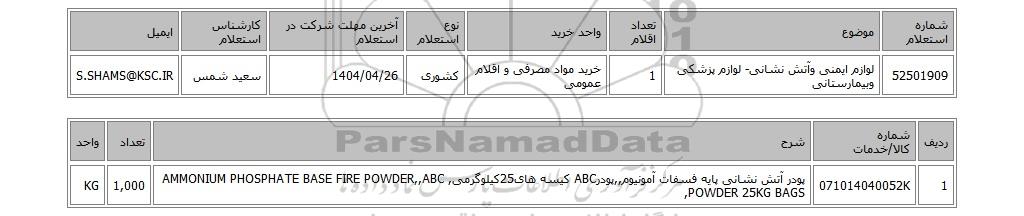 | 52501909 | لوازم ایمنی وآتش نشانی- لوازم پزشکی وبیمارستانی | 1 | خرید مواد مصرفی و اقلام عمومی | کشوری | 1404/04/26 | سعید شمس | S.SHAMS@KSC.IR |