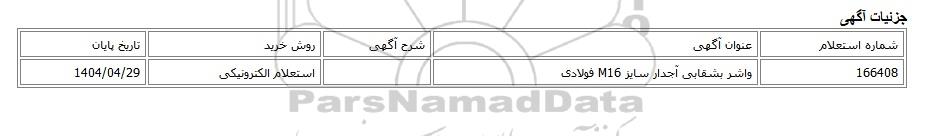 | 166408 | واشر بشقابی آجدار سایز M16 فولادی | استعلام الکترونیکی | 1404/04/29 |