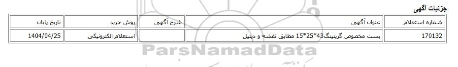 | 170132 | بست مخصوص گریتینگ43*25*15 مطابق نقشه و دیتیل | استعلام الکترونیکی | 1404/04/25 |