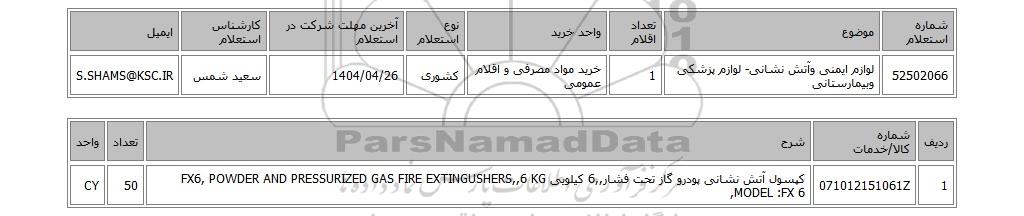 | 52502066 | لوازم ایمنی وآتش نشانی- لوازم پزشکی وبیمارستانی | 1 | خرید مواد مصرفی و اقلام عمومی | کشوری | 1404/04/26 | سعید شمس | S.SHAMS@KSC.IR |