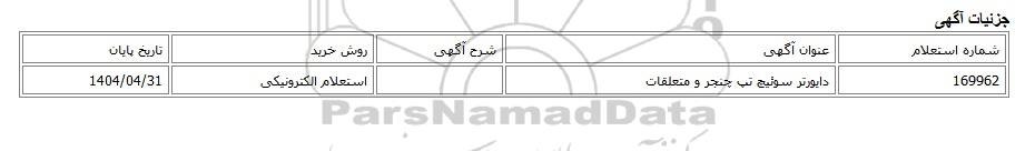| 169962 | دایورتر سوئیچ تپ چنجر و متعلقات | استعلام الکترونیکی | 1404/04/31 |