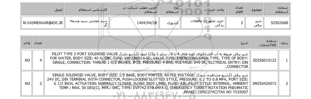 52502068شیر برقی2خرید تجهیزات وقطعات یدکیکشوری1404/04/28سید مجتبی سید وسمه گرM.VASMEHGAR@KSC.IR