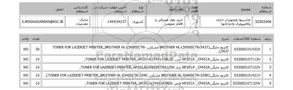 | 52502006 | ماشینها وتجهیزات اداری وکامپیوتری واجزاءآنها | 5 | خرید مواد مصرفی و اقلام عمومی | کشوری | 1404/04/27 | صادق مقدمیان | S.MOGHADAMIAN@KSC.IR |