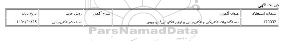 | 170032 | دستگاههای الکتریکی و الکترونیکی و لوازم الکتریکی/خودرویی | استعلام الکترونیکی | 1404/04/25 |