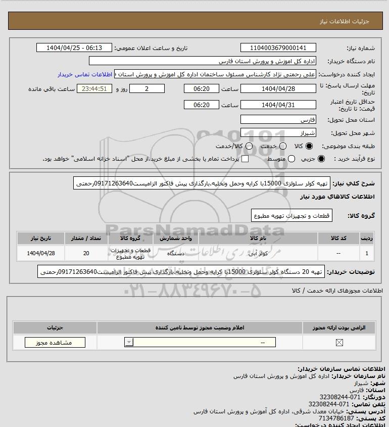 شرح کلی نیاز: تهیه کولر سلولزی 15000با کرایه وحمل وتخلیه.بارگذاری پیش فاکتور الزامیست09171263640رحمتی