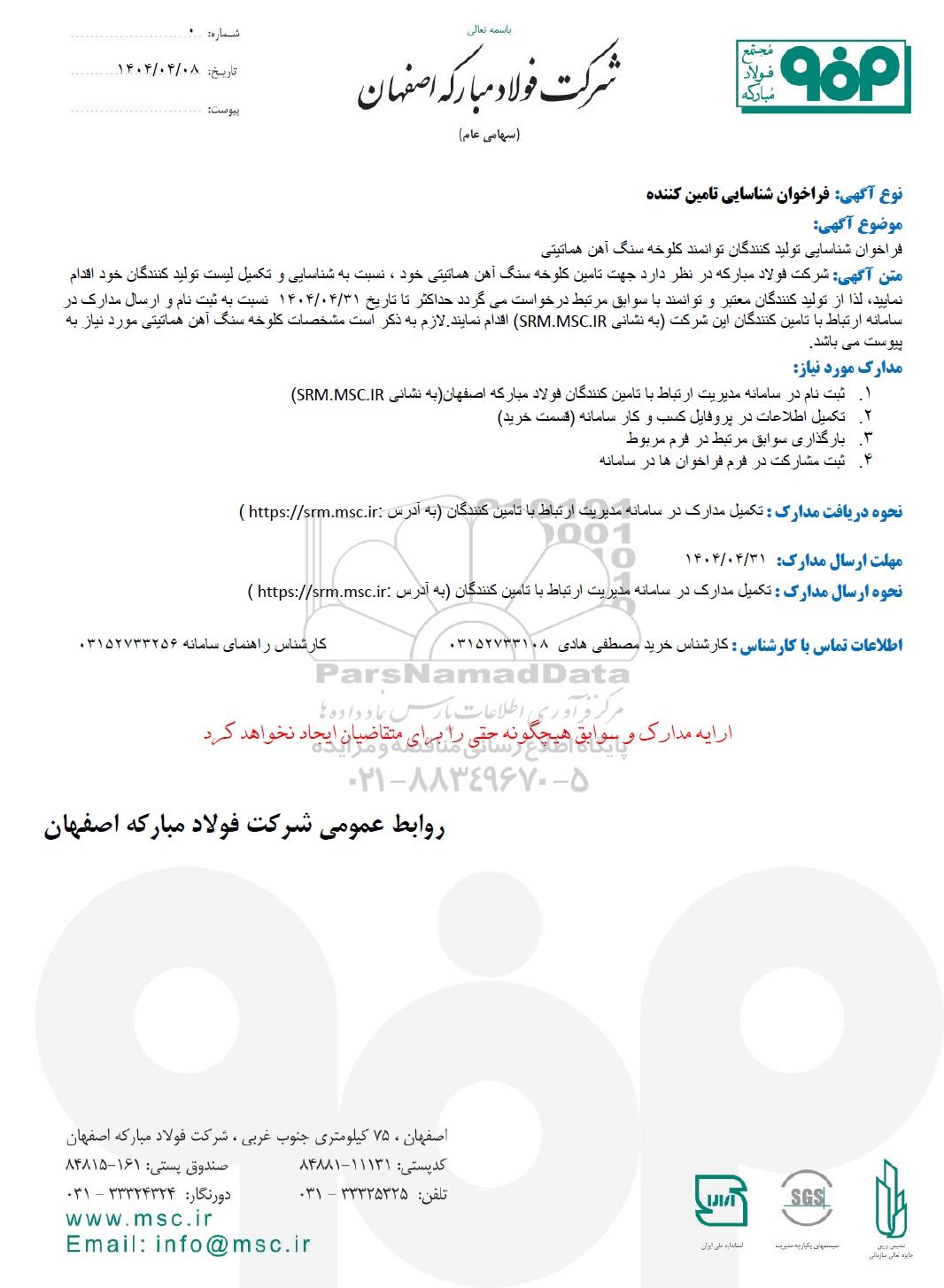 متن آگهی: شرکت فولاد مبارکه در نظر دارد جهت تامین کلوخه سنگ آهن هماتیتی خود، نسبت به شناسایی و تکمیل لیست تولید کنندگان خود اقدام نمایید، لذا از تولید کنندگان معتبر و توانمند با سوابق مرتبط درخواست میگردد حداکثر تا تاریخ 1404.04.31 نسبت به ثبت نام و ارسال مدارک در سامانه ارتباط با تامین کنندگان این شرکت (به نشانی SRM.MSC.IR) اقدام نمایند. لازم به ذکر است مشخصات کلوخه سنگ آهن هماتیتی مورد نیاز به پیوست می باشد.