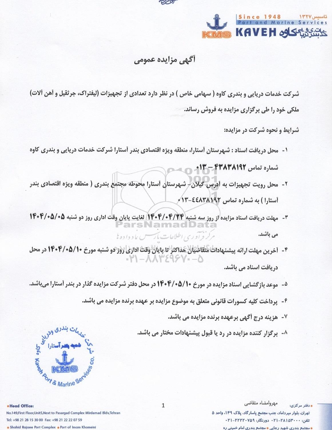 شرکت خدمات دریایی و بندری کاوه (سهامی خاص) در نظر دارد تعدادی از تجهیزات (لیفتراک، جرثقیل و آهن آلات) ملکی خود را طی برگزاری مزایده به فروش رساند.