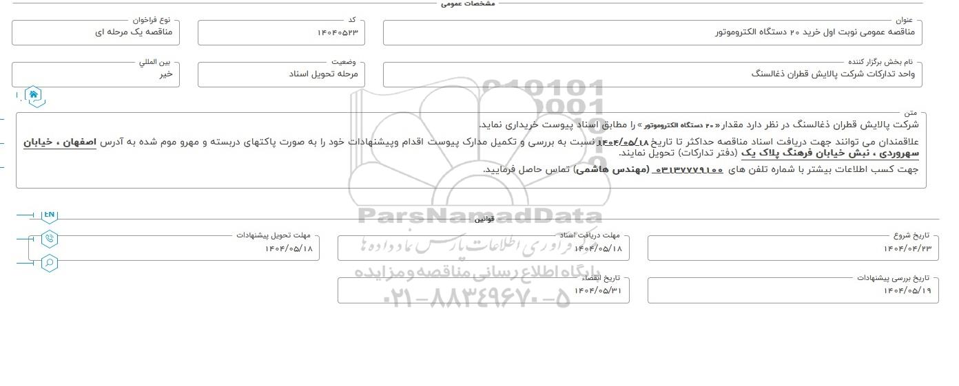 علاقمندان می توانند جهت دریافت اسناد مناقصه حداکثر تا تاریخ 1404.05.18 نسبت به بررسی و تکمیل مدارک پیوست اقدام و پیشنهادات خود را به صورت پاکتهای دربسته و مهر و موم شده به اصفهان، خیابان سهروردی، نبش خیابان فرهنگ پلاک یک (دفتر تدارکات) تحویل نمایند.